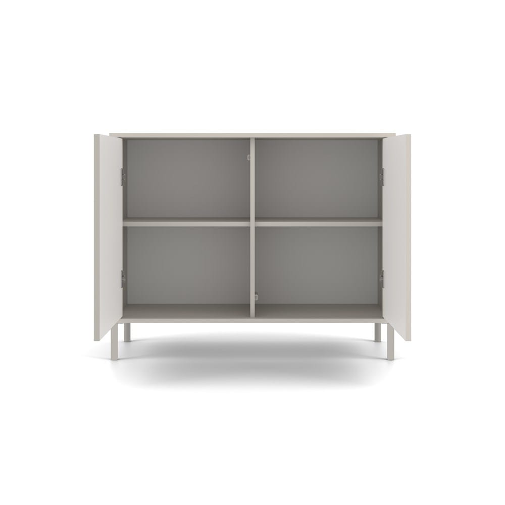 Nowoczesny system TIP-ON umożliwia wygodne użytkowanie bez uchwytów — wystarczy delikatnie nacisnąć drzwi, aby otworzyć szafkę. Komoda oferuje dużą przestrzeń do przechowywania, zachowując przy tym minimalistyczny i elegancki charakter, pasujący do wielu aranżacji.