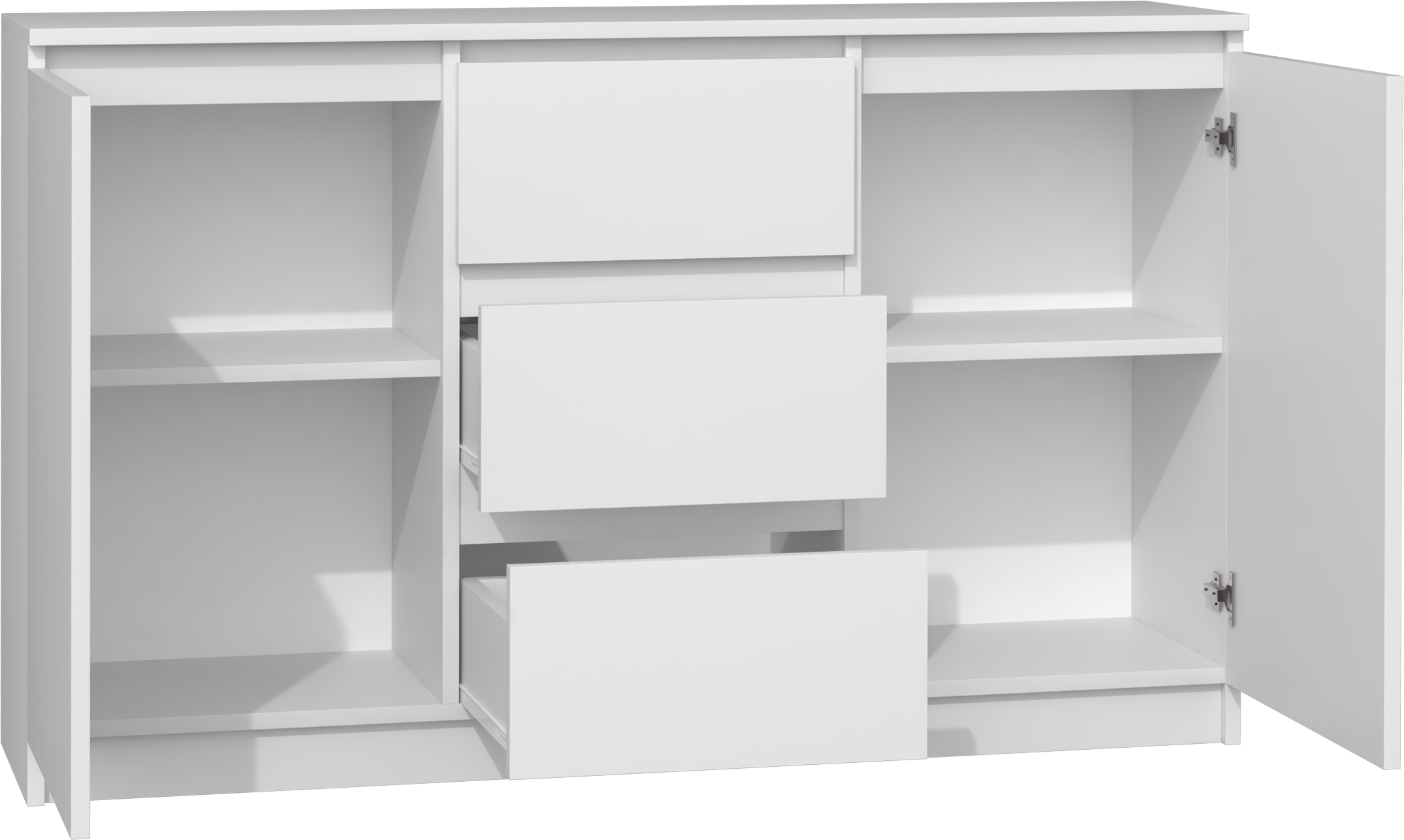 Wnętrze komody składa się z półek oraz trzech szuflad, które pomogą przy rozmieszczaniu rzeczy. Łatwiej będzie znaleźć to, czego się szuka.