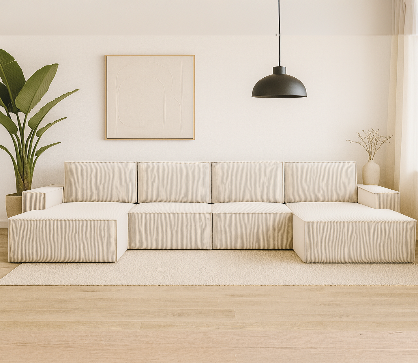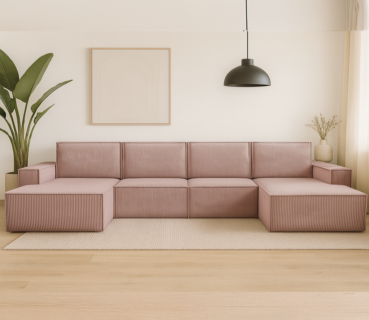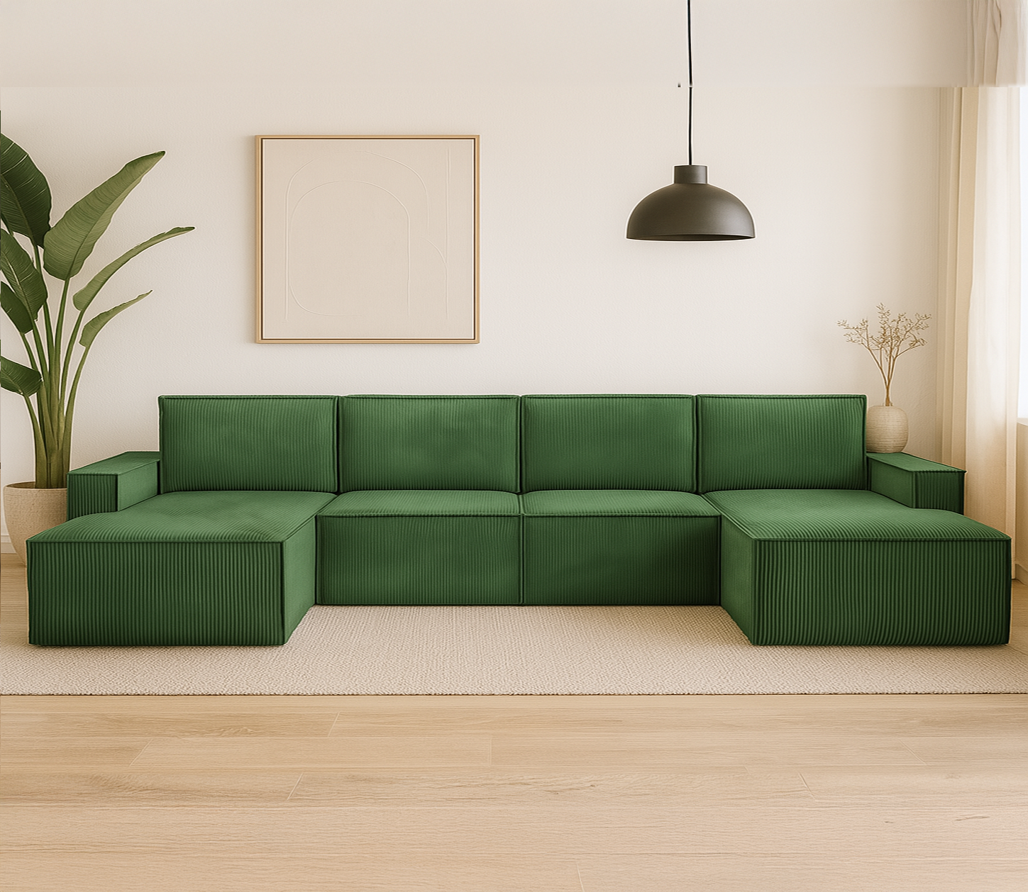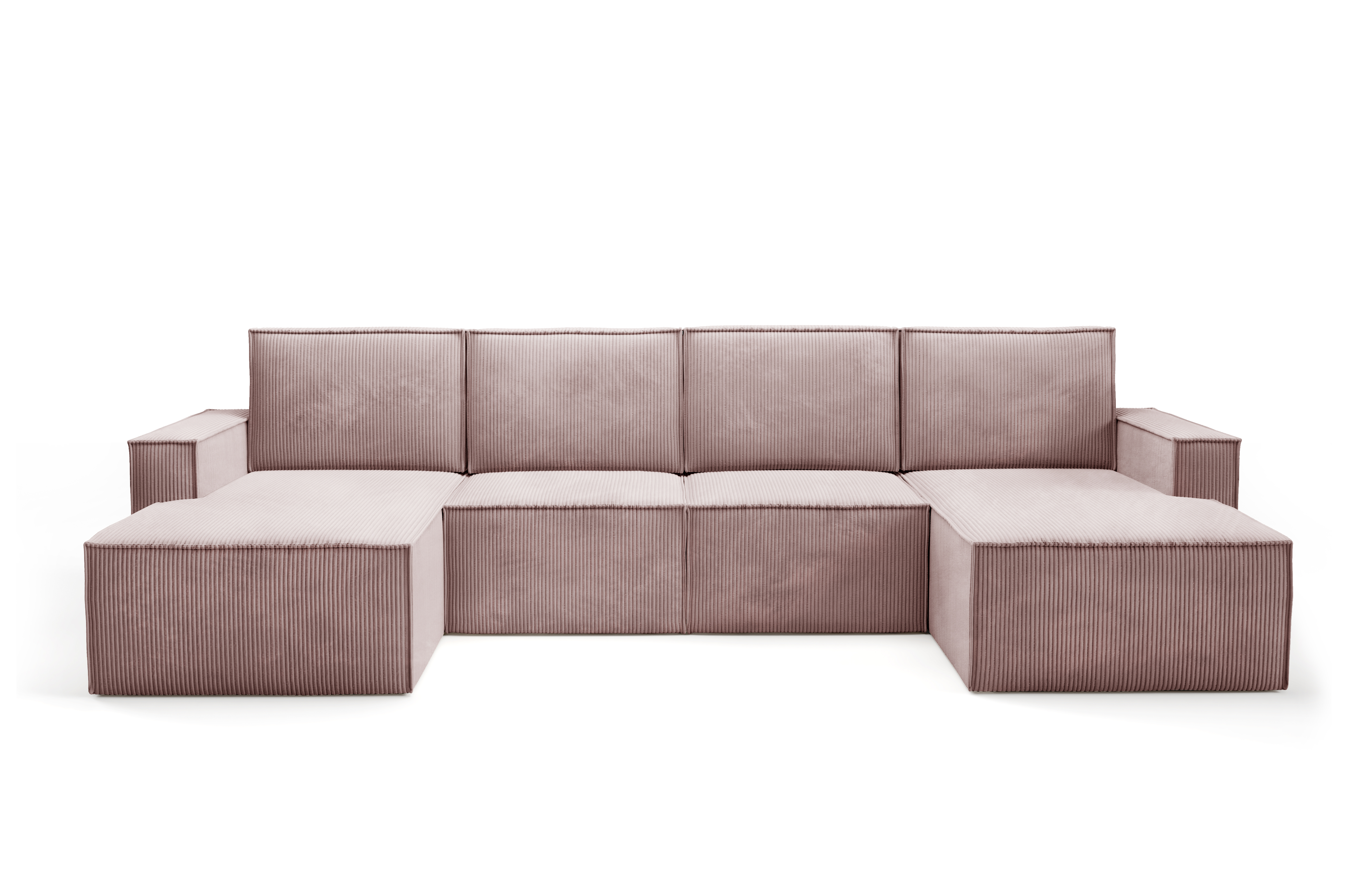 Duży narożnik VISION w kształcie litery U to imponujący mebel wypoczynkowy, który stanie się centralnym punktem każdego salonu. Jego modułowa budowa, szerokie otomany i tapicerka z miękkiego sztruksu POSO zapewniają maksymalny komfort i możliwość personalizacji.
