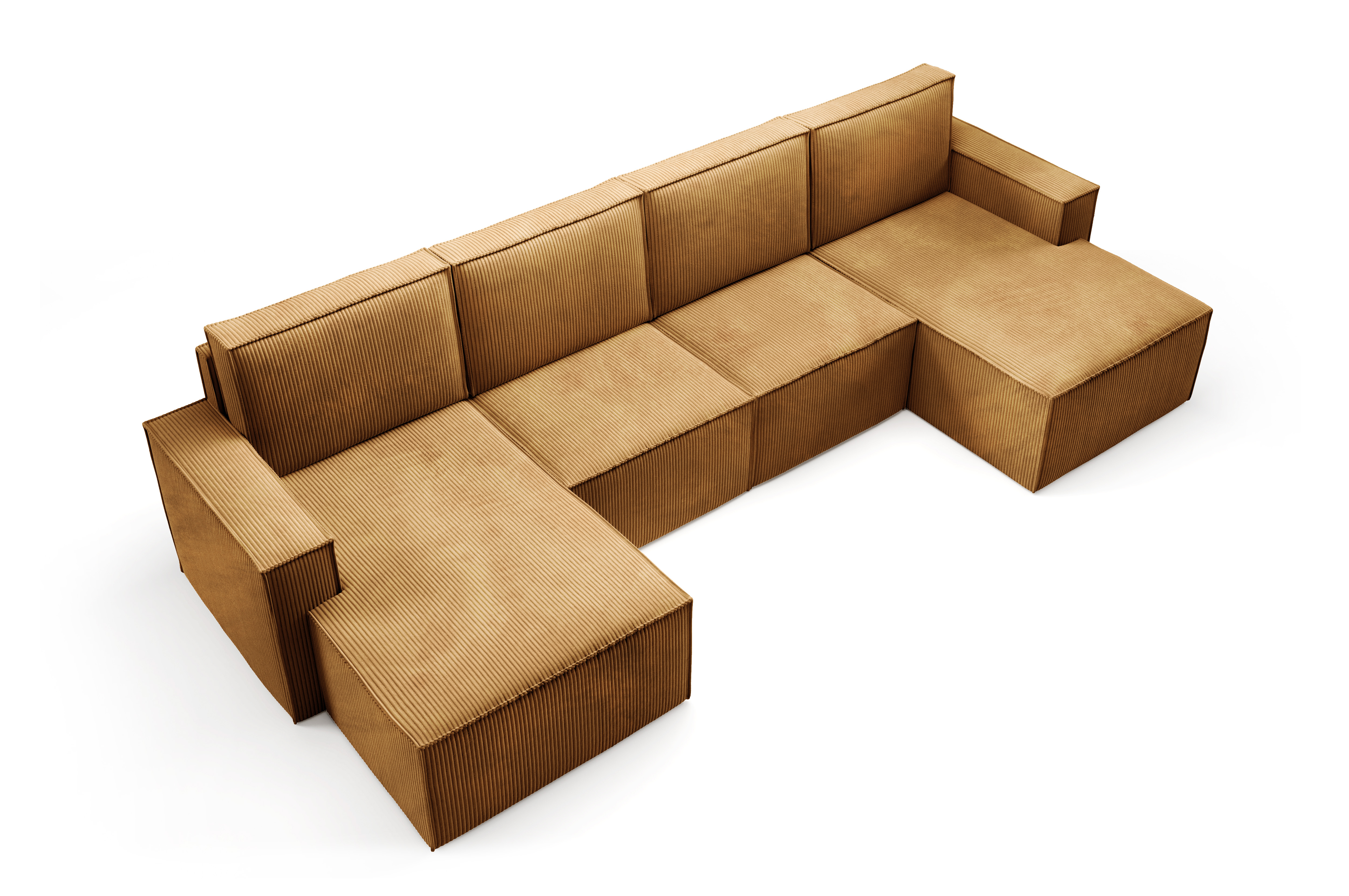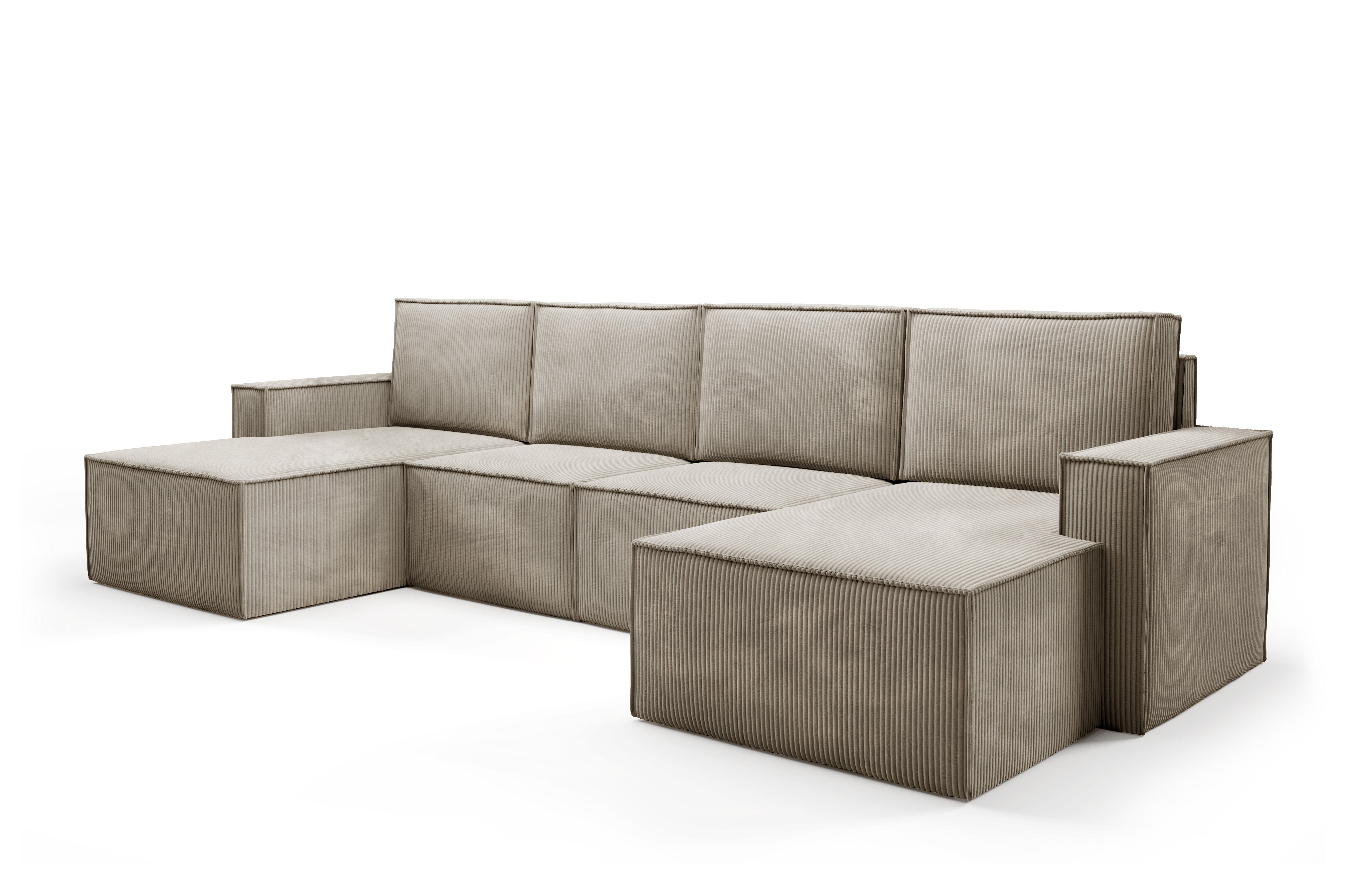 Duży narożnik VISION w kształcie litery U to imponujący mebel wypoczynkowy, który stanie się centralnym punktem każdego salonu. Jego modułowa budowa, szerokie otomany i tapicerka z miękkiego sztruksu POSO zapewniają maksymalny komfort i możliwość personalizacji.