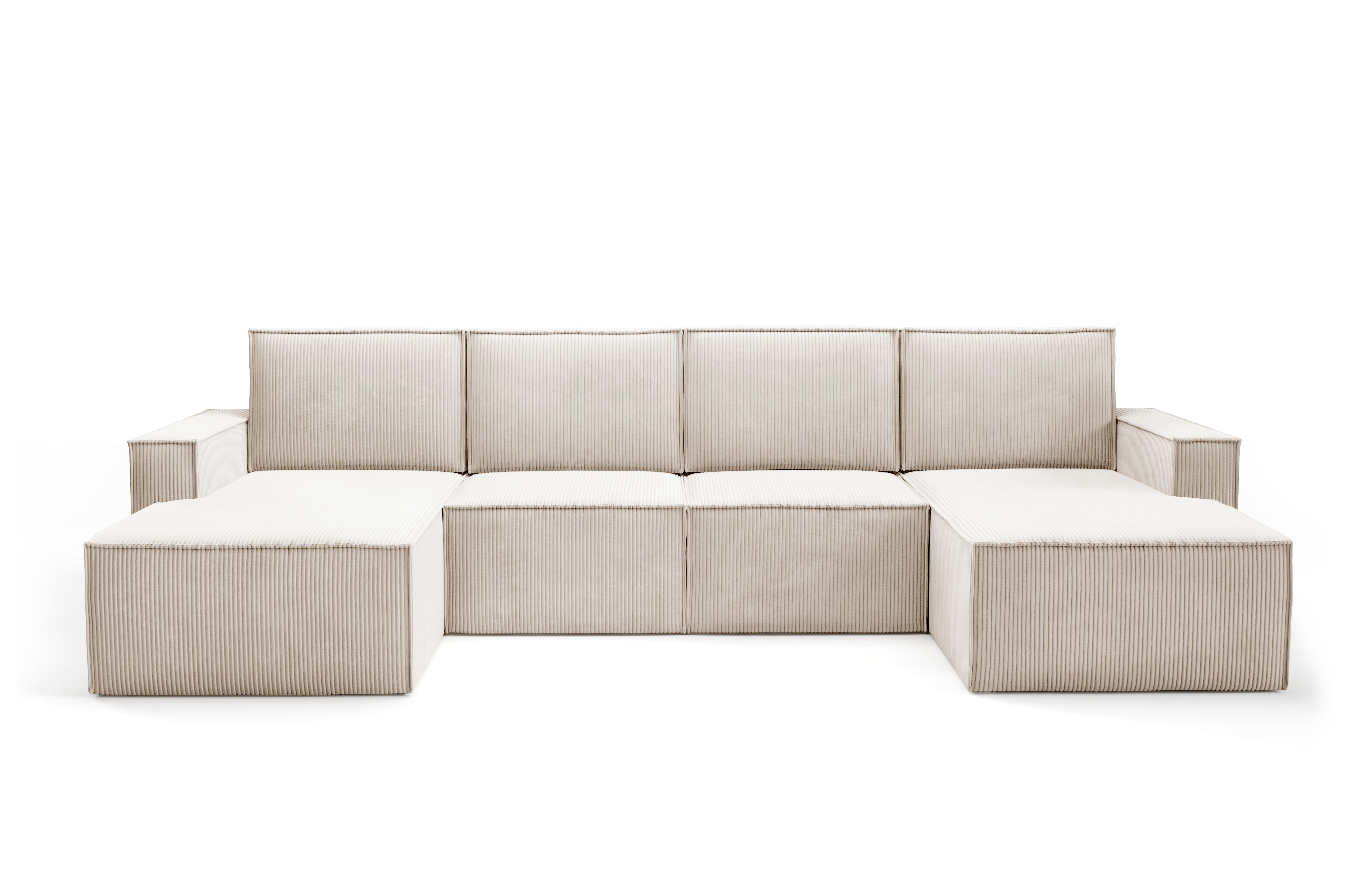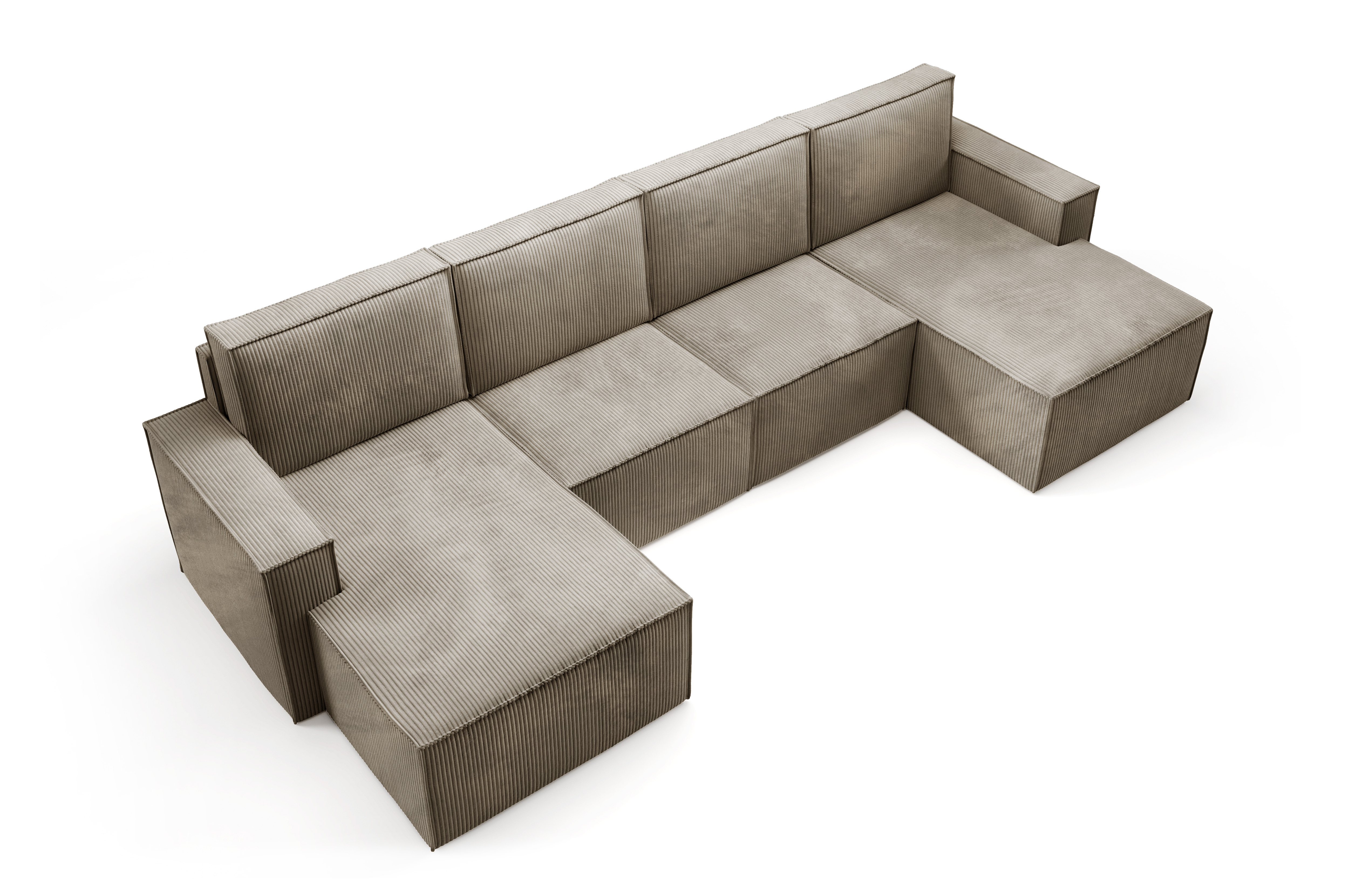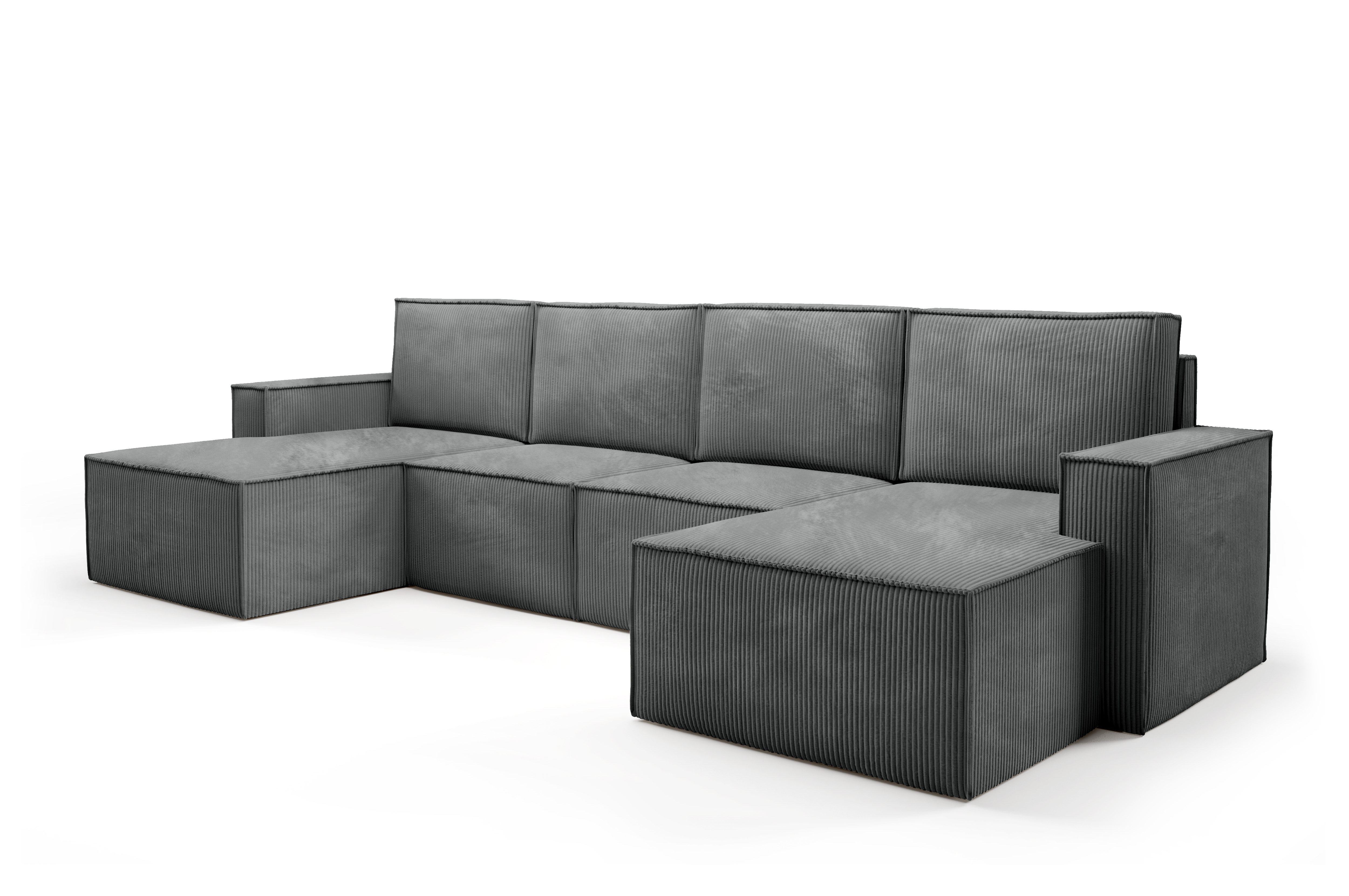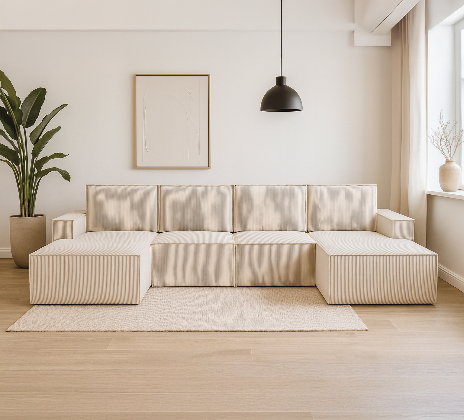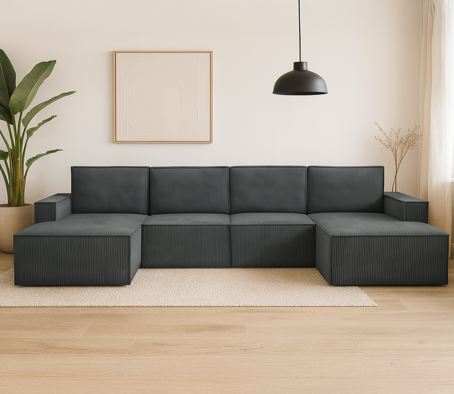 Duży narożnik VISION w kształcie litery U to imponujący mebel wypoczynkowy, który stanie się centralnym punktem każdego salonu. Jego modułowa budowa, szerokie otomany i tapicerka z miękkiego sztruksu POSO zapewniają maksymalny komfort i możliwość personalizacji.