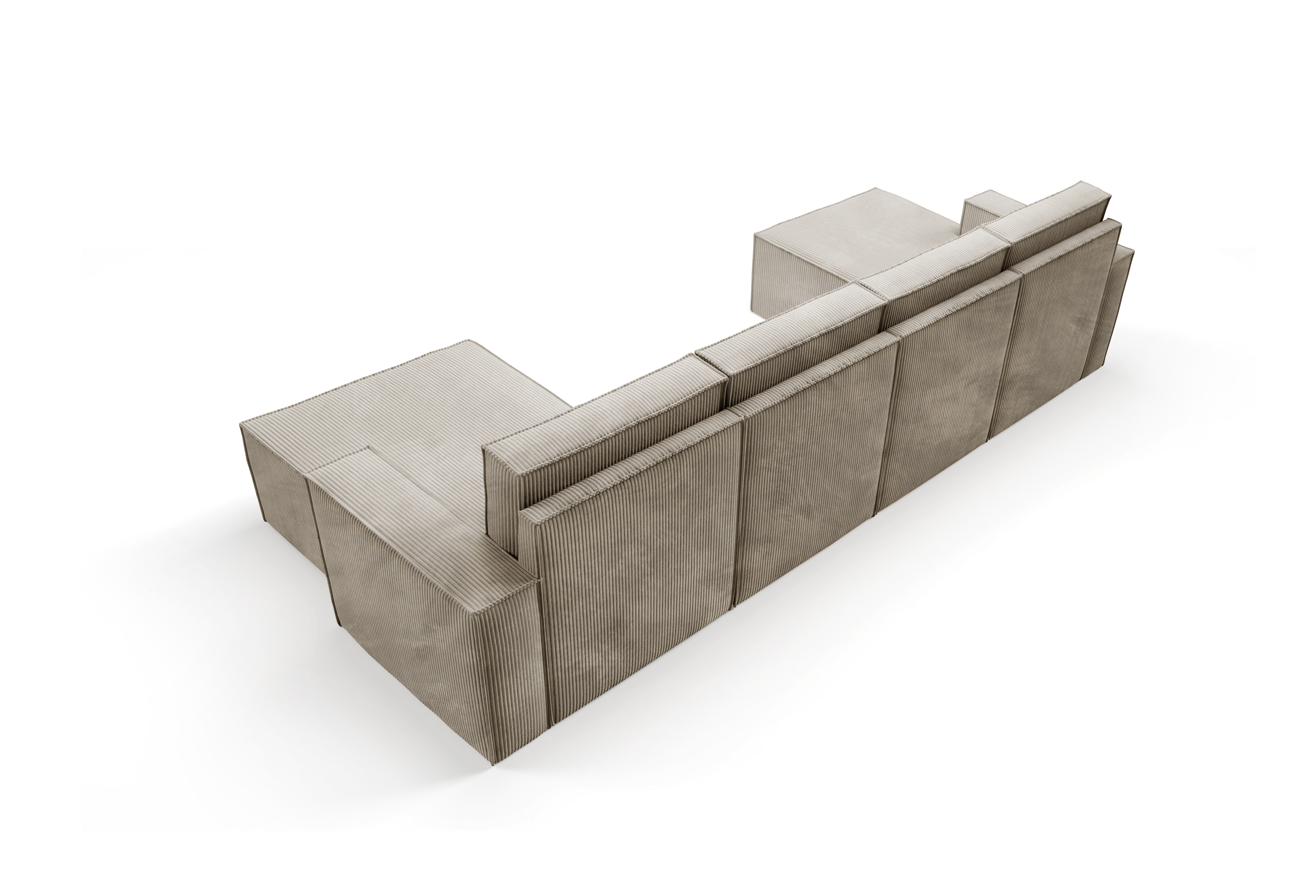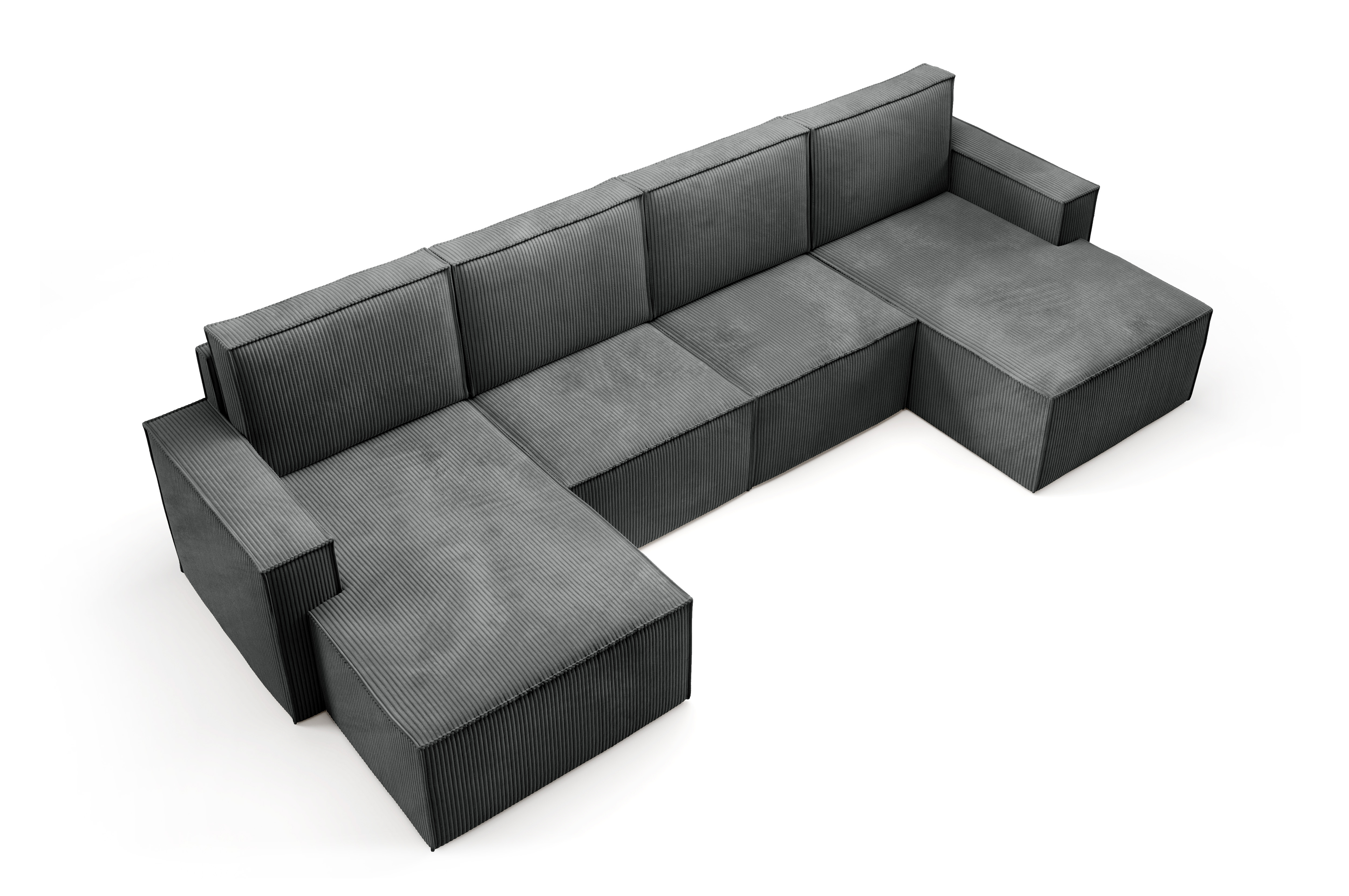 Duży narożnik VISION w kształcie litery U to imponujący mebel wypoczynkowy, który stanie się centralnym punktem każdego salonu. Jego modułowa budowa, szerokie otomany i tapicerka z miękkiego sztruksu POSO zapewniają maksymalny komfort i możliwość personalizacji.