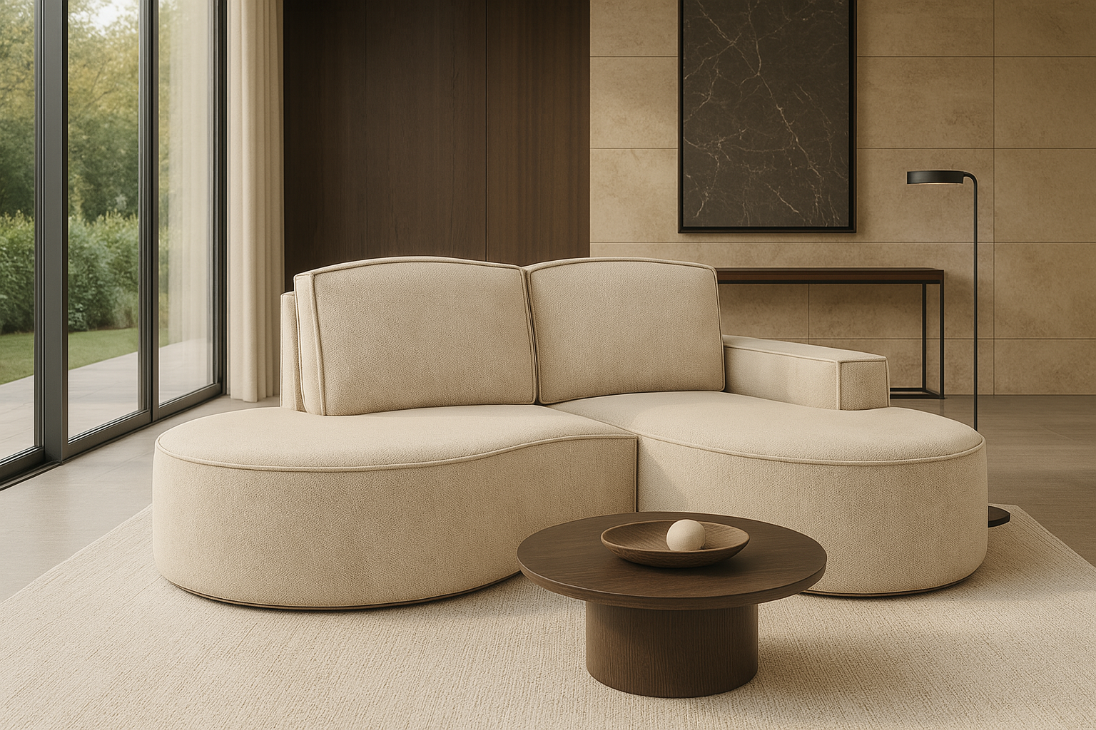 - Obity tył mebla – narożnik wolnostojący, do ustawienia na środku salonu