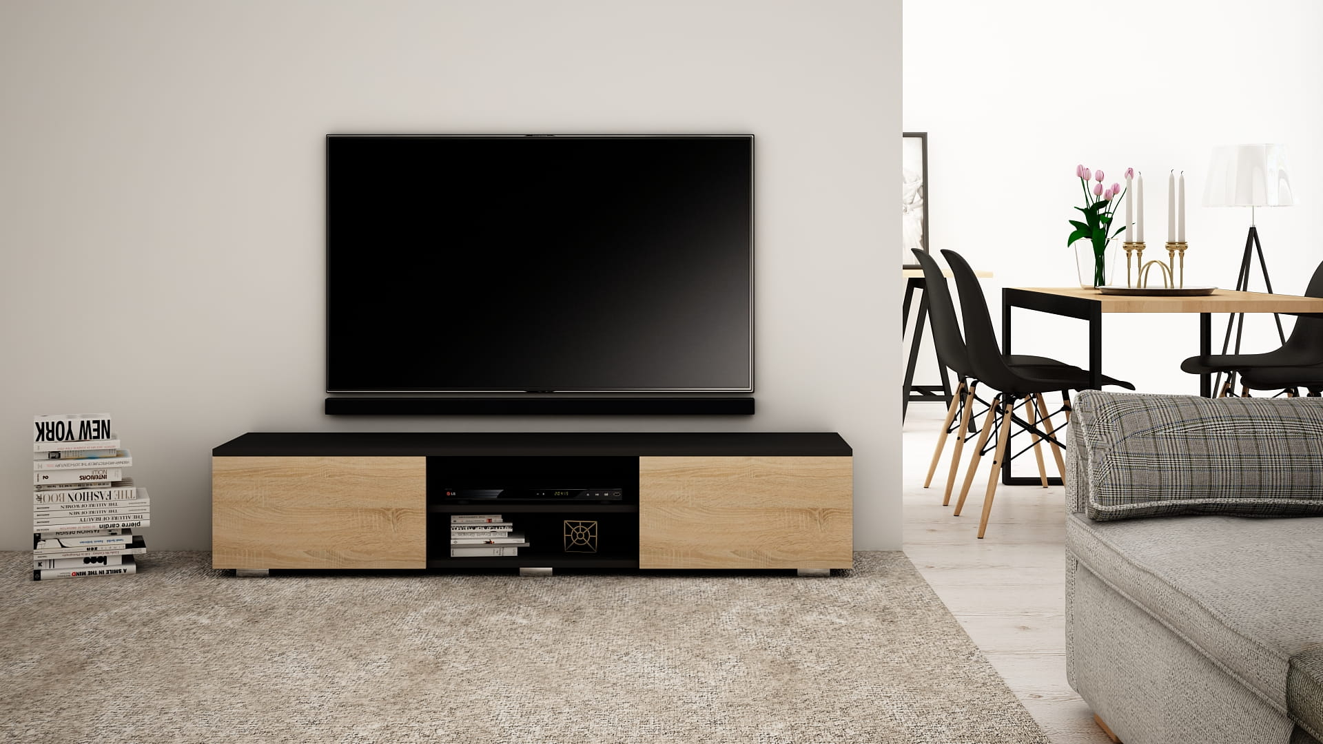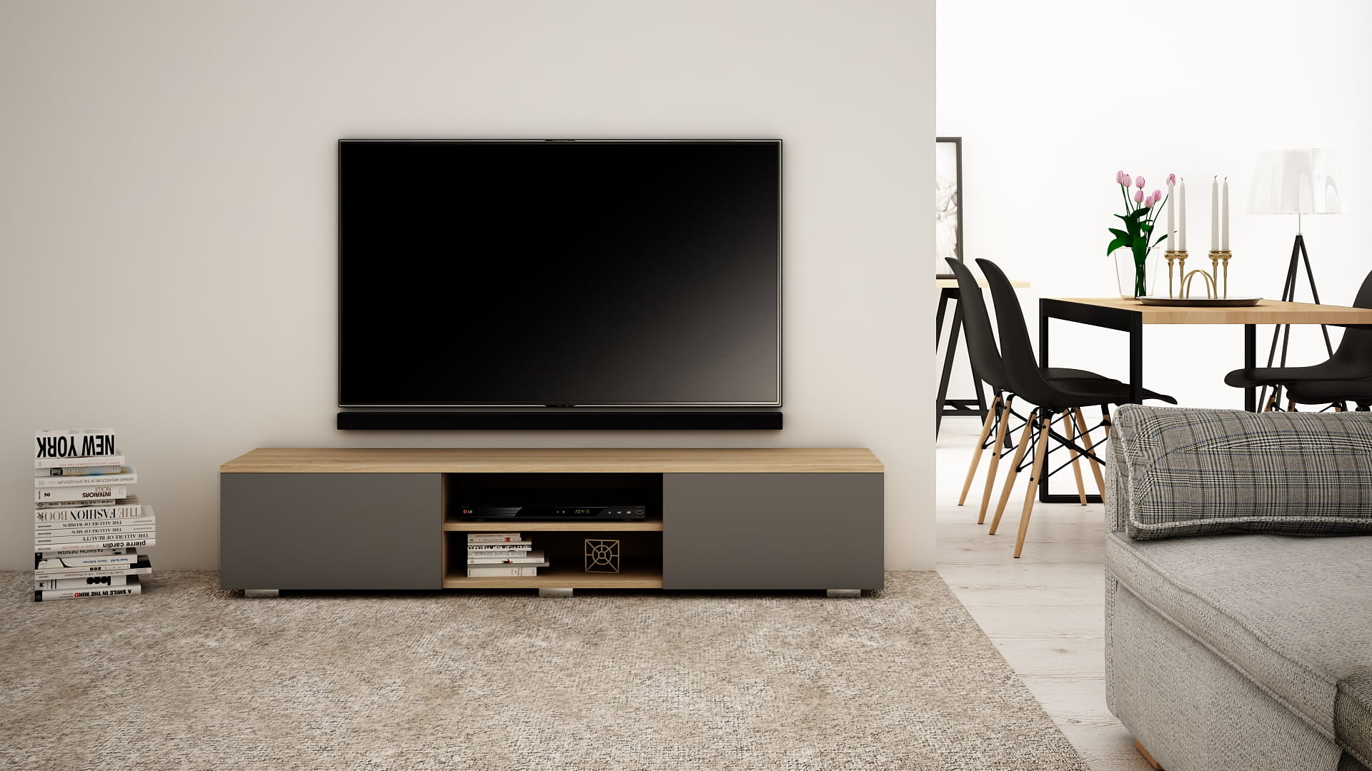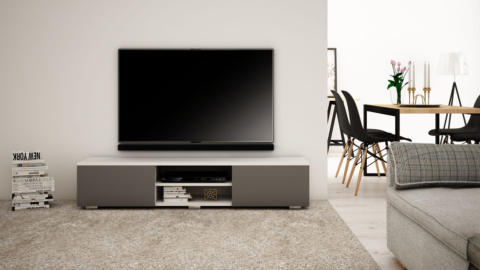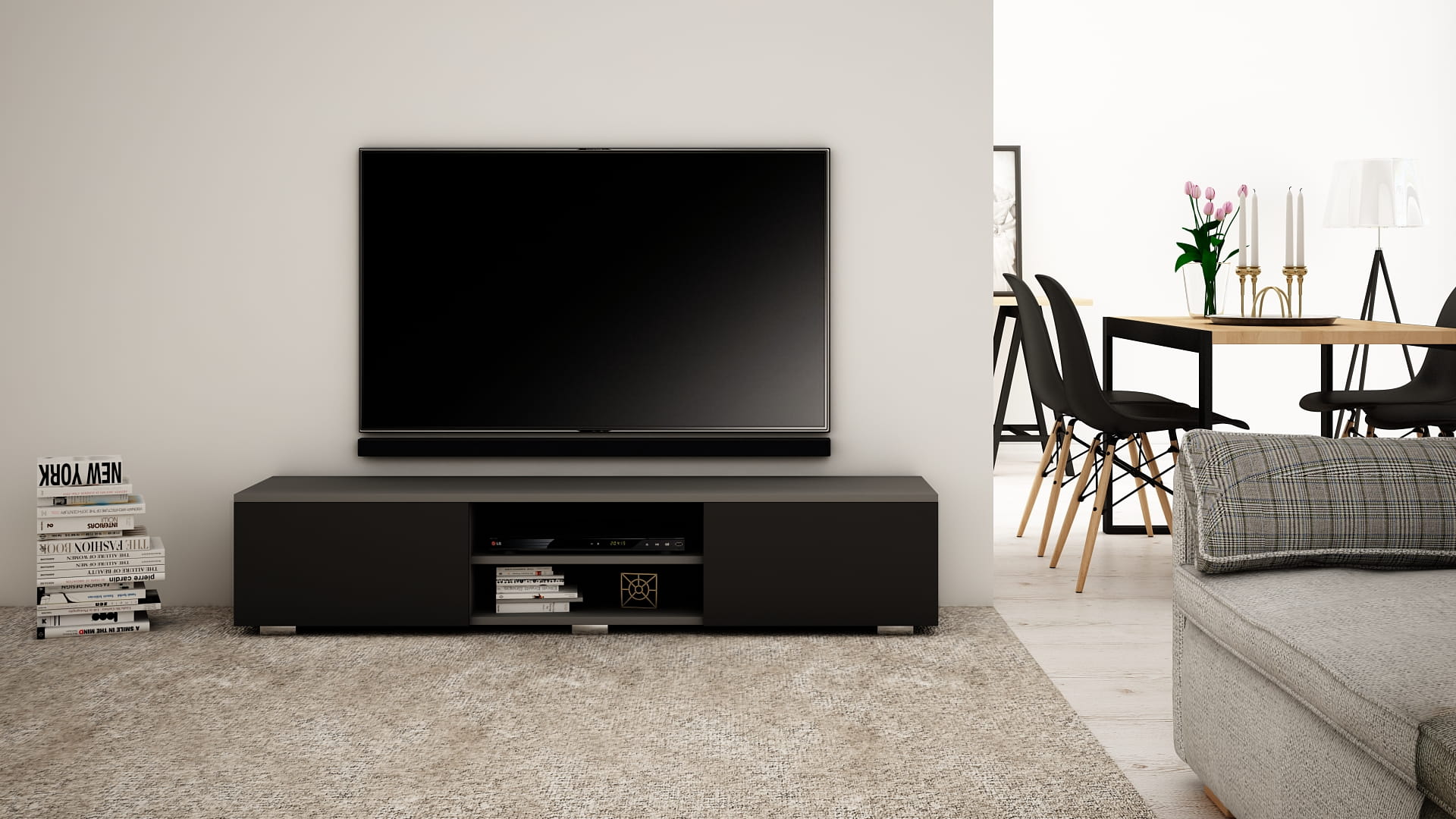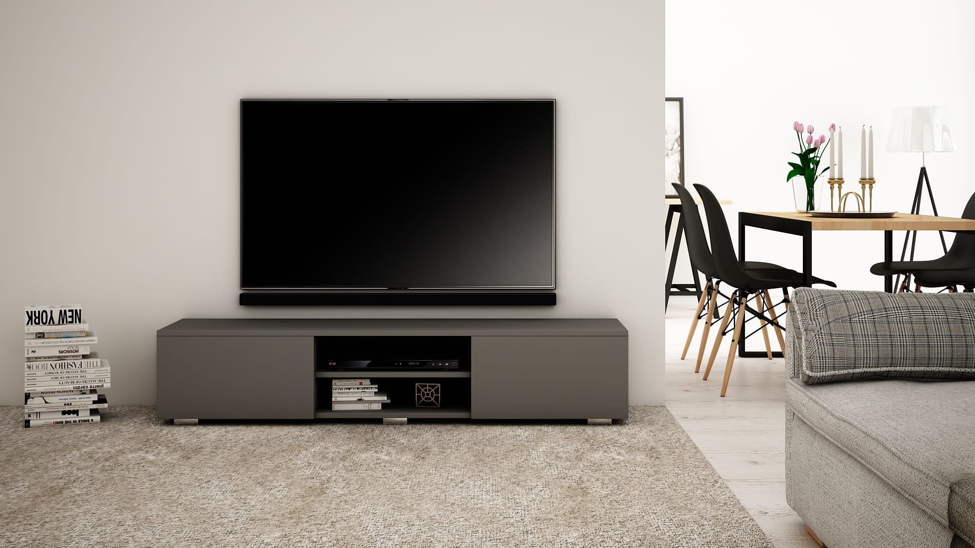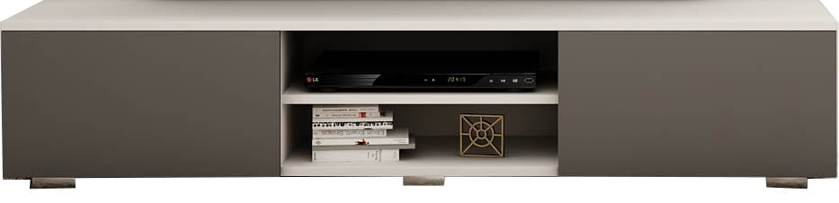 OPIS: W/S/G 30/140/35 cm- korpus oraz fronty w macie, po środku regulowana półka na sprzęt RTV, dwie przestronne komory otwierane dotykowo TIP-ON (bez uchwytu), płyta tylna szafki wykonana z HDF.