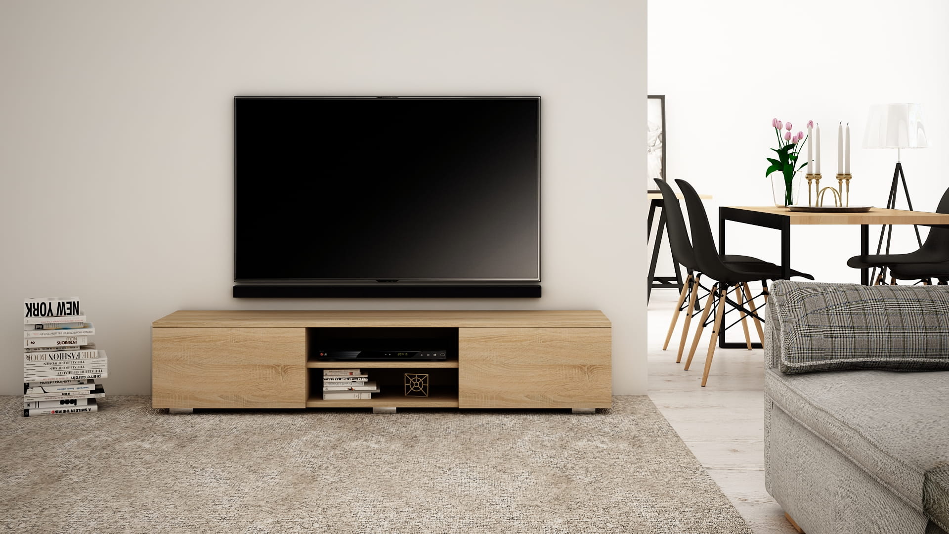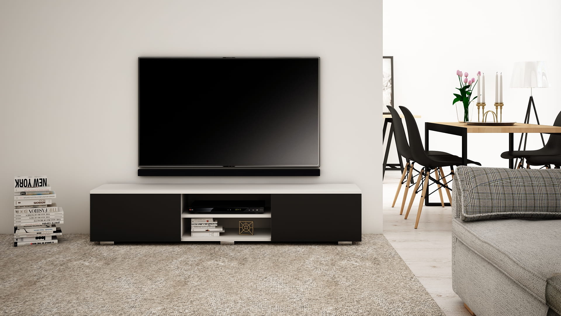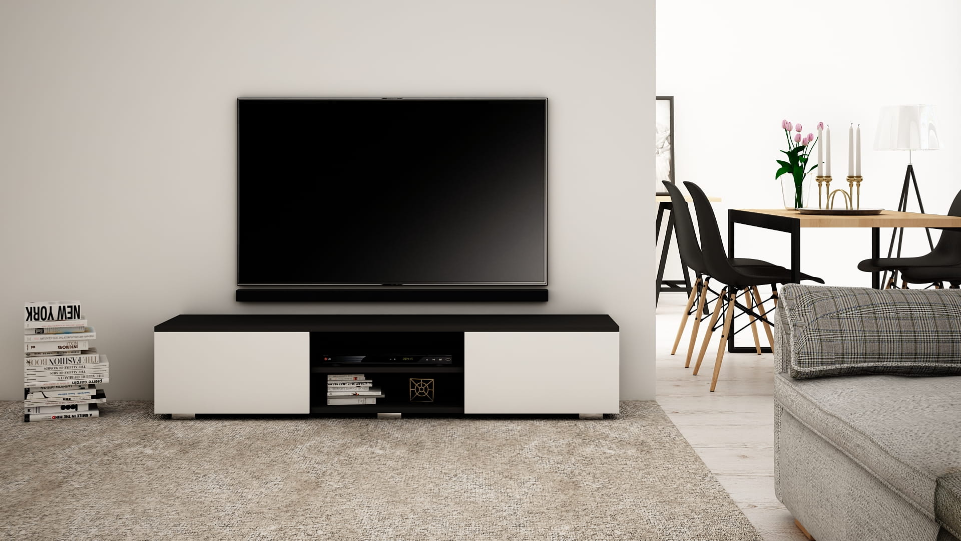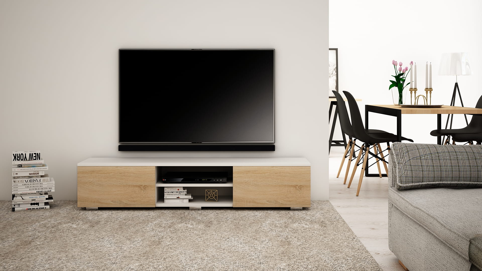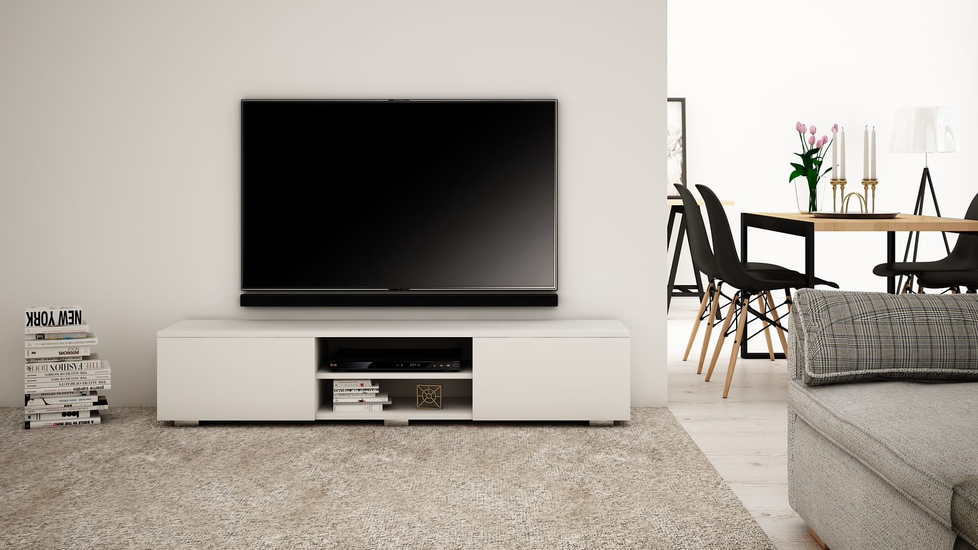 OPIS: W/S/G 30/140/35 cm- korpus oraz fronty w macie, po środku regulowana półka na sprzęt RTV, dwie przestronne komory otwierane dotykowo TIP-ON (bez uchwytu), płyta tylna szafki wykonana z HDF.