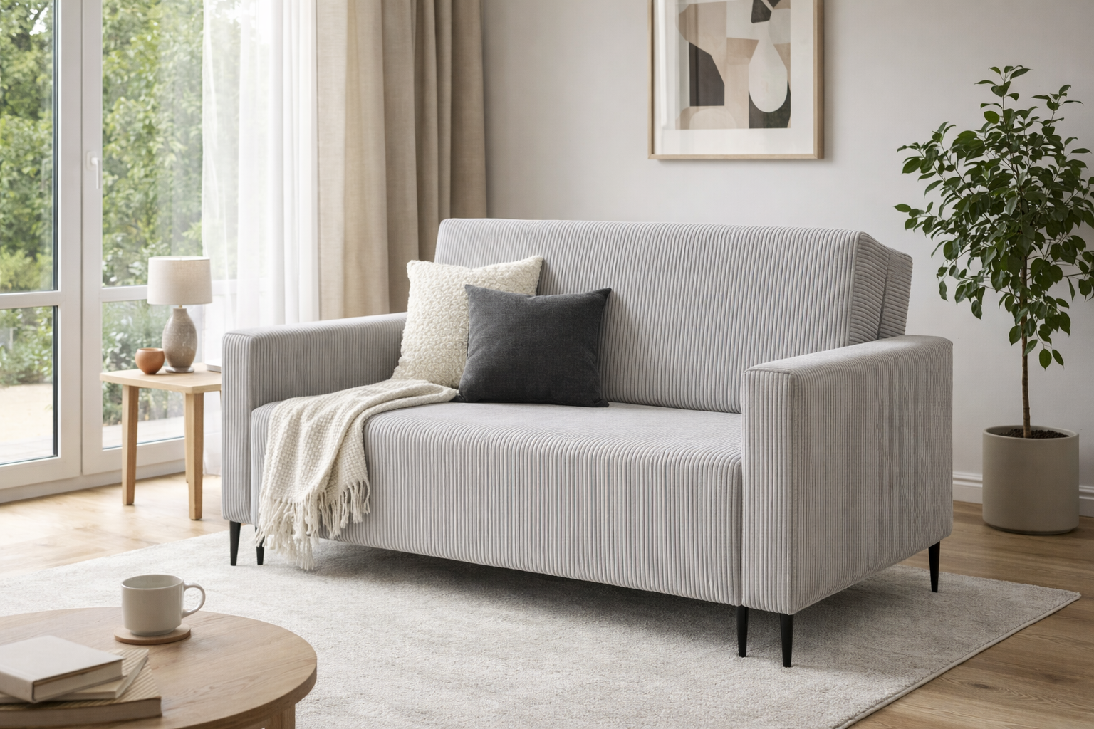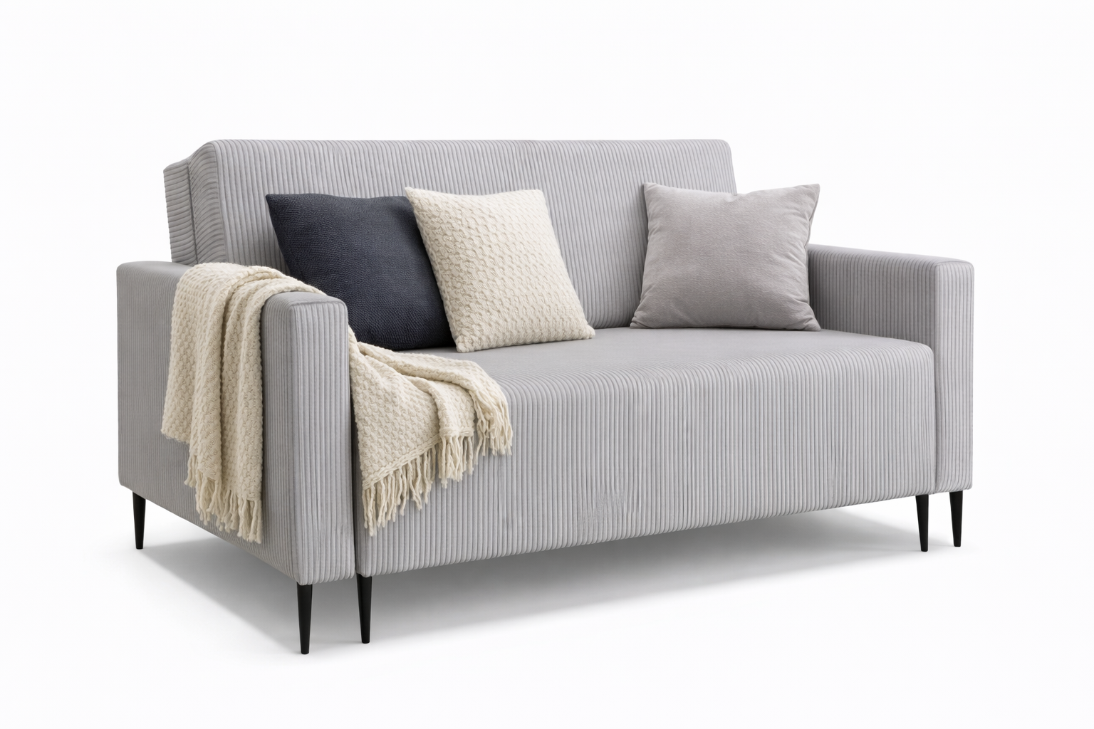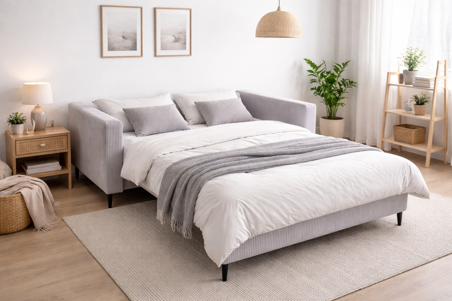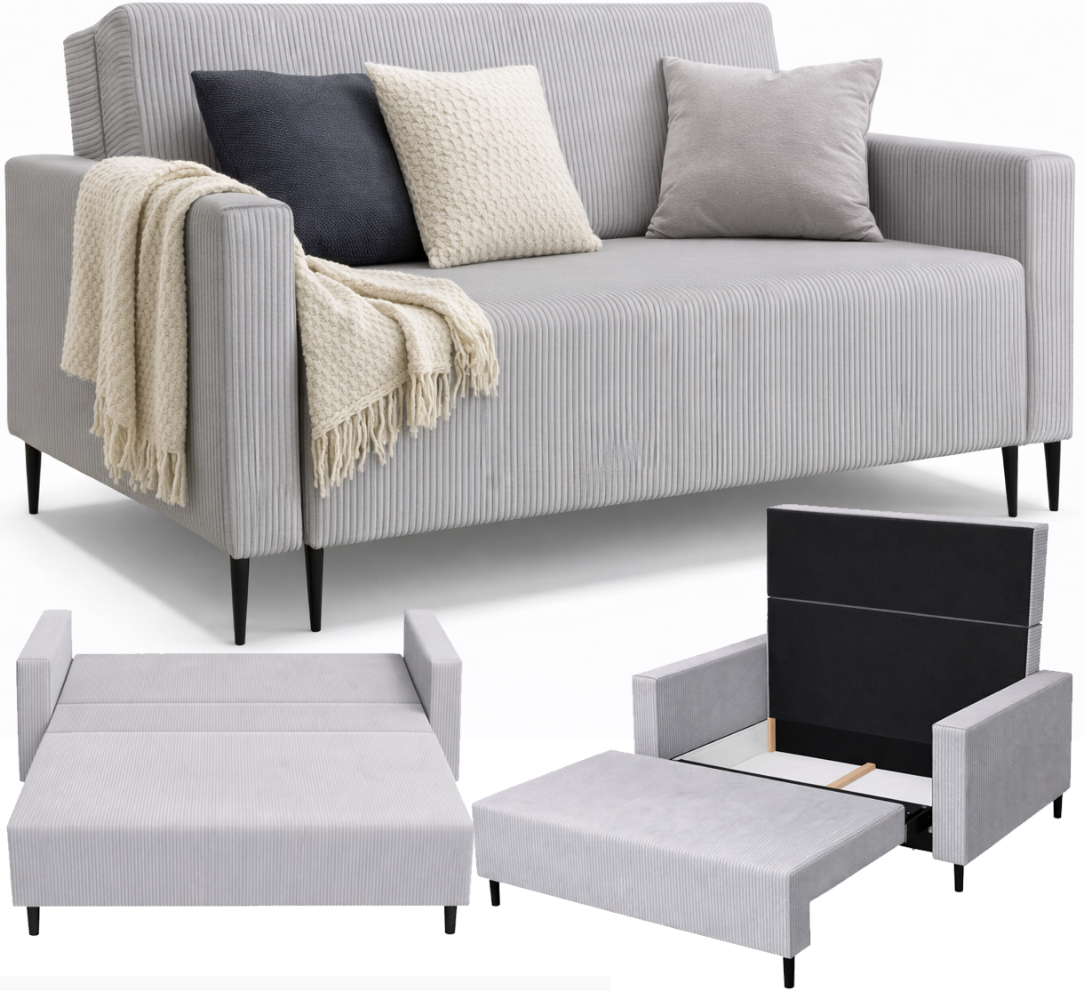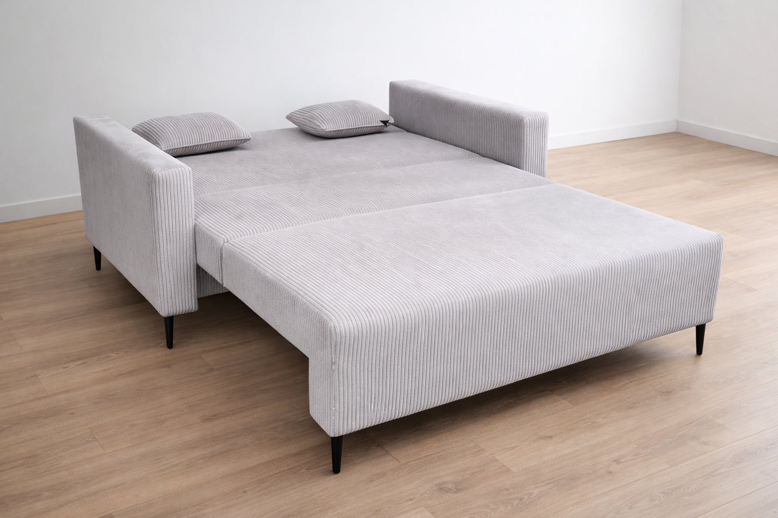 Po rozłożeniu sofa tworzy równą, stabilną powierzchnię do spania. Idealne rozwiązanie do mniejszych mieszkań, kawalerek i pokojów gościnnych.